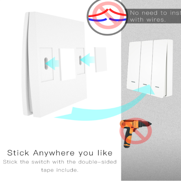 El interruptor virtual está pegado a la pared, por lo que no utiliza cables tradicionales y se comunica de forma inalámbrica vía Radio Frecuencia con el Módulo.
