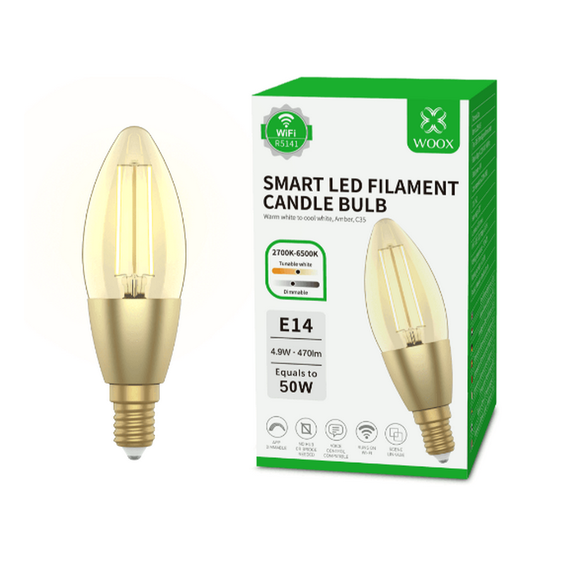 La bombilla de filamento LED C37 Smart Candle R5141 de WOOX combina tecnología de iluminación moderna con un aspecto clásico y romántico. Se conecta directamente a tu router Wi-Fi y ofrece control remoto y automático. Este tipo de luz de color ámbar cálido y ahorrador de energía es la deseada con el foco puesto en una iluminación vintage de diseño de calidad a un coste muy asequible. WOOX Home te trae esta iluminación clásica con un toque de control inteligente. Puede conectar el WOOX R5141 a su enrutador WiFi doméstico sin necesidad de un concentrador u otro servicio. Una vez que el R5141 esté conectado a la aplicación gratuita WOOX Home, Tuya o Smart Life en su dispositivo Android o iOS, podrá controlar el R5141 desde cualquier lugar y en cualquier momento. Puedes establecer horarios, crear escenas en la aplicación,