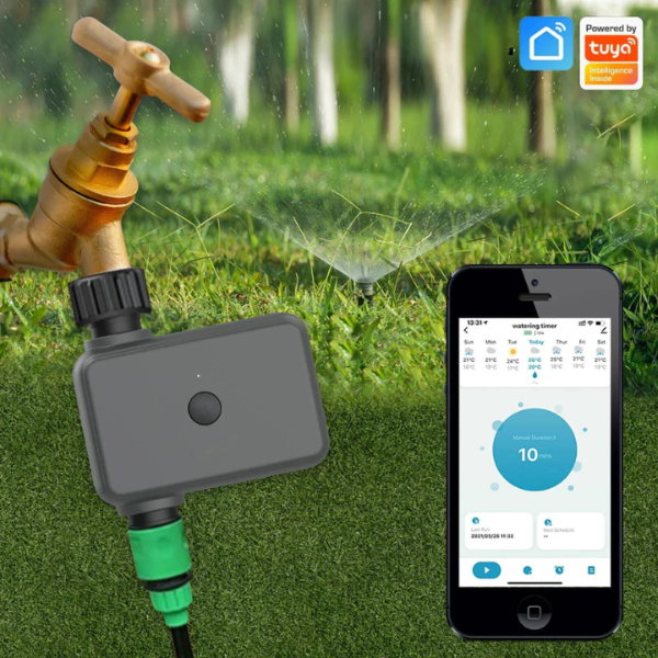Multifuncional con 3 modos: automático, riego manual y retraso por lluvia, disponible en la aplicación Tuya y Smartlife.