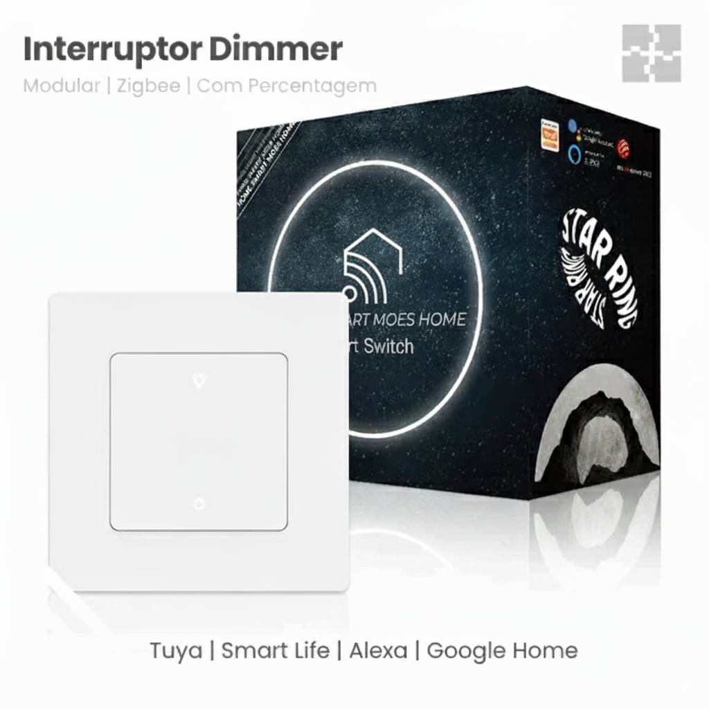 Interruptor Dimmer Smart ZigBee: Requer Tuya ZigBee Gateway Hub e fio neutro. Apresenta textura atualizada e design de anel em estrela com luz indicadora. Oferece melhor experiência em casa.
