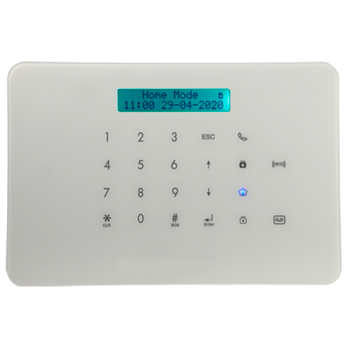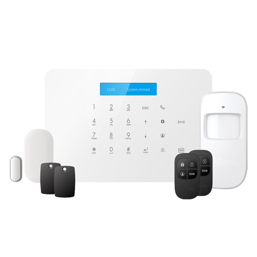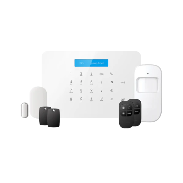Kit formado por: Painel (com bateria de back up e sirene), 2 controlo remoto, 2 chaveiros de proximidade RFID, 1 contacto magnético porta/janela, 1 detector de movimento PIR