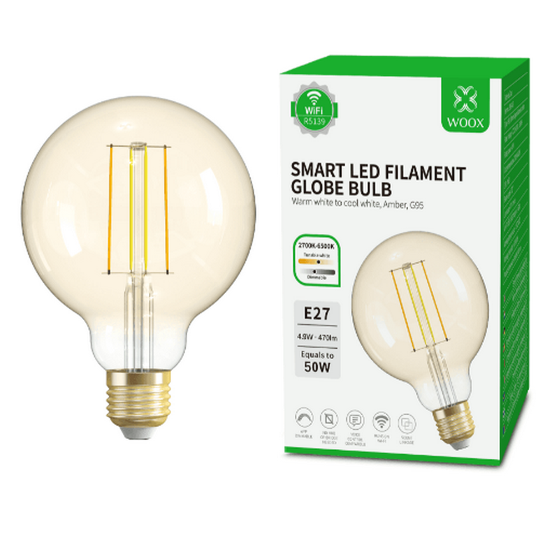 A Lâmpada LED de Filamento Inteligente G95 WOOX R5139 traz a versão moderna das antigas lâmpadas de filamento de carbono com suas formas e luz quente amarelada ou branca com acabamento em vidro tipo âmbar. Este tipo de luz de coloração âmbar quente com economia de energia é desejada com o foco na iluminação vintage de design de qualidade a um custo muito acessível. Esta iluminação clássica com um toque de controle inteligente é trazida para você pela WOOX Home. Você pode conectar o WOOX R5139 ao seu roteador WiFi em casa sem a necessidade de um hub ou outro serviço. Assim que o R5139 estiver conectado ao aplicativo gratuito WOOX Home, Tuya ou Smart Life em seu dispositivo Android ou iOS, você poderá controlar o R5139 de qualquer lugar, a qualquer hora. Você pode definir horários, criar cenas no aplicativo, conectar o R5139 com outros dispositivos WOOX através do mesmo aplicativo e ainda pode controlá-lo por serviços de controle de voz como Amazon Alexa e Google Assistant.