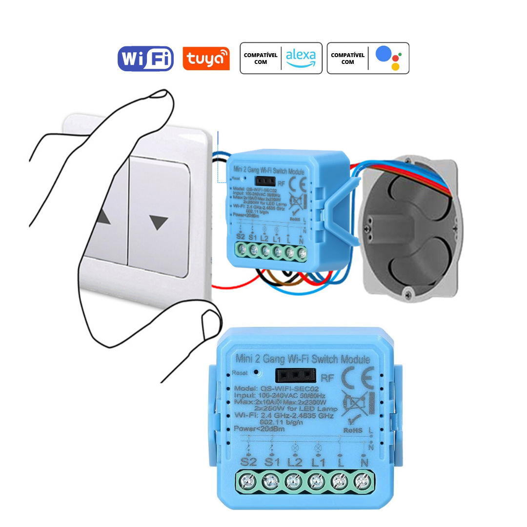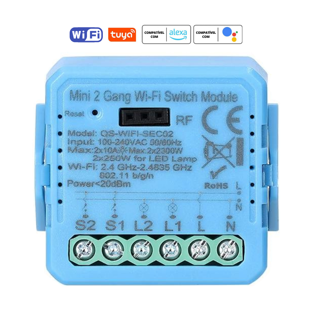 Este é um módulo ON/OFF Duplo, ou seja, podes colocar por detrás do teu interruptor duplo convencional, as tuas luzes ficarão inteligentes e com a capacidade de gerir por aplicação Tuya, por Voz e de qualquer parte do mundo.