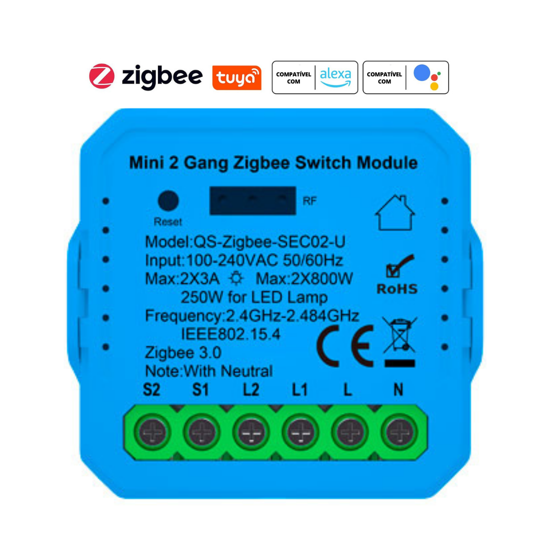 Mini Módulo de Luzes Duplo (2 gangs) – Zigbee 3.0 – Tuya / Smartlife