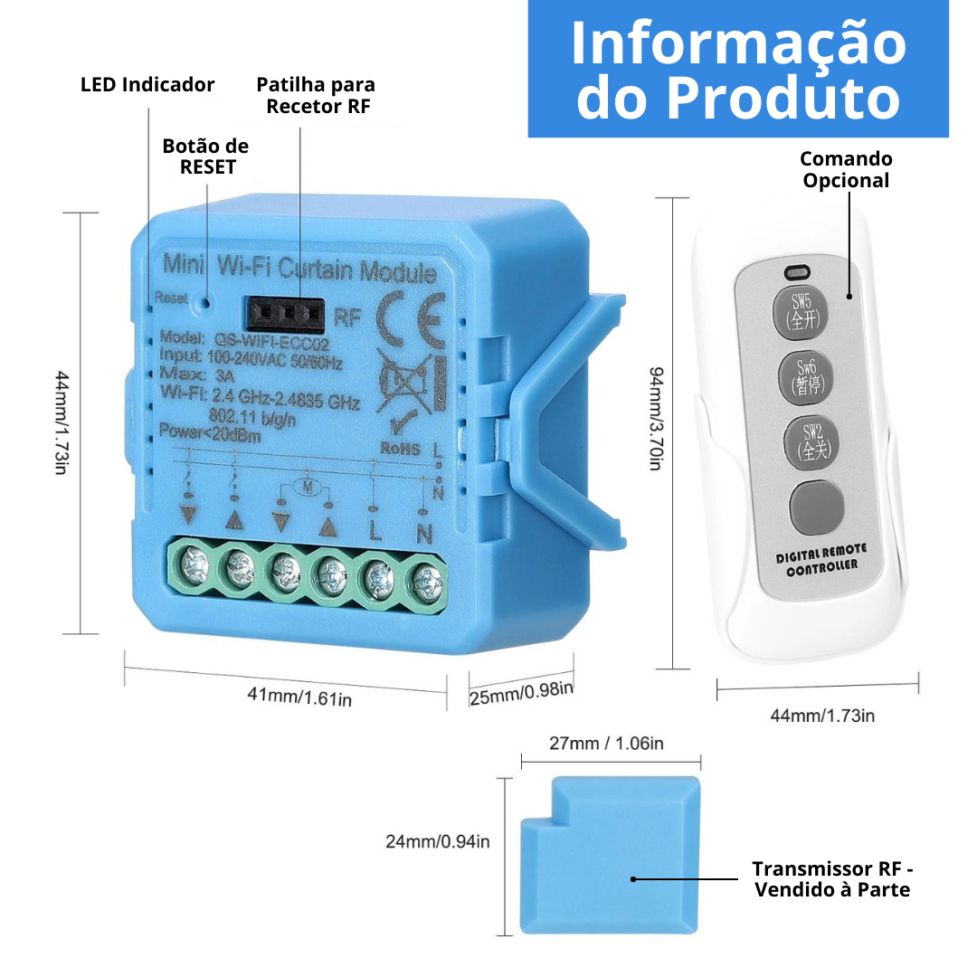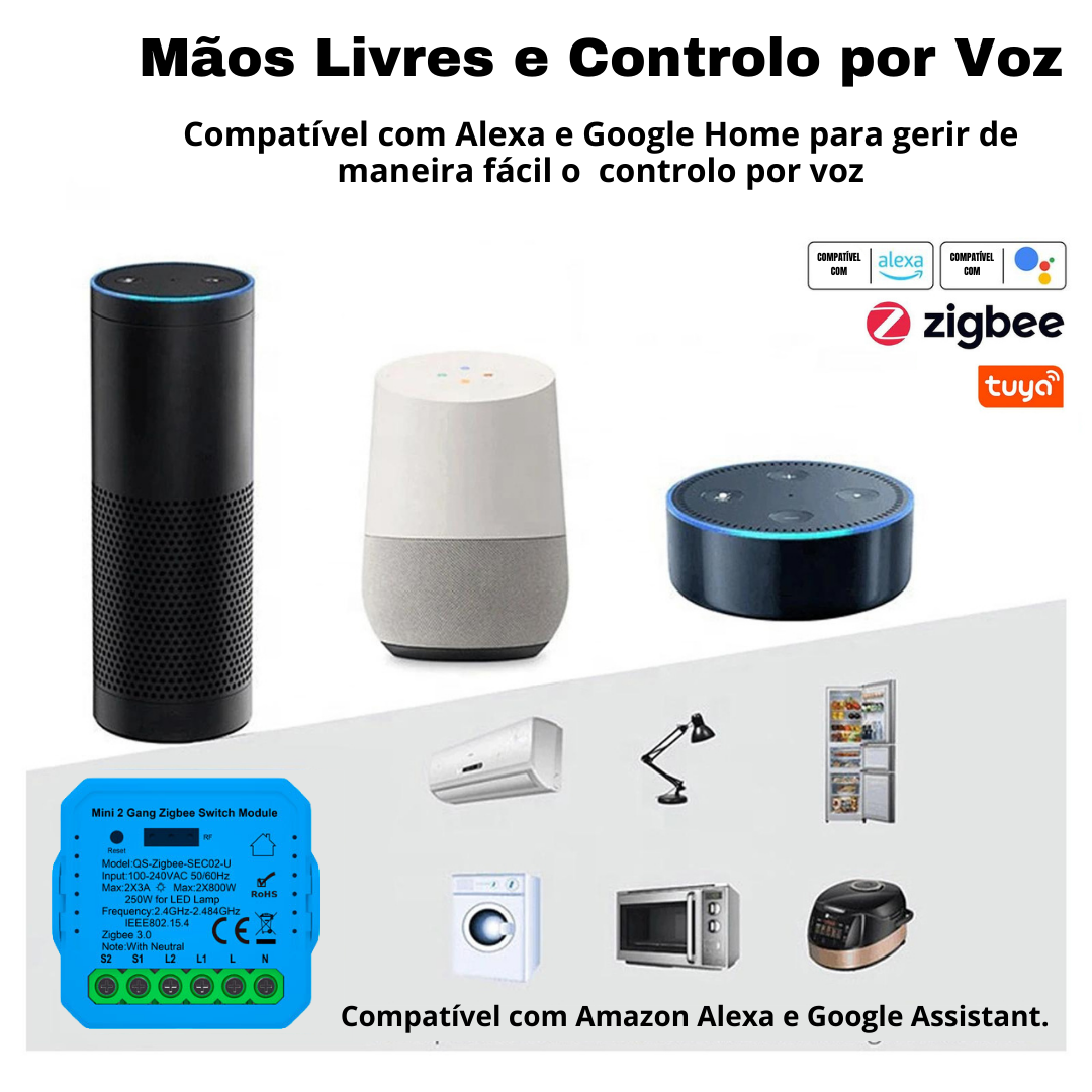 Este é um módulo ON/OFF Duplo, ou seja, podes colocar por detrás do teu interruptor duplo convencional, as tuas luzes ficarão inteligentes e com a capacidade de gerir por aplicação Tuya, por Voz e de qualquer parte do mundo.