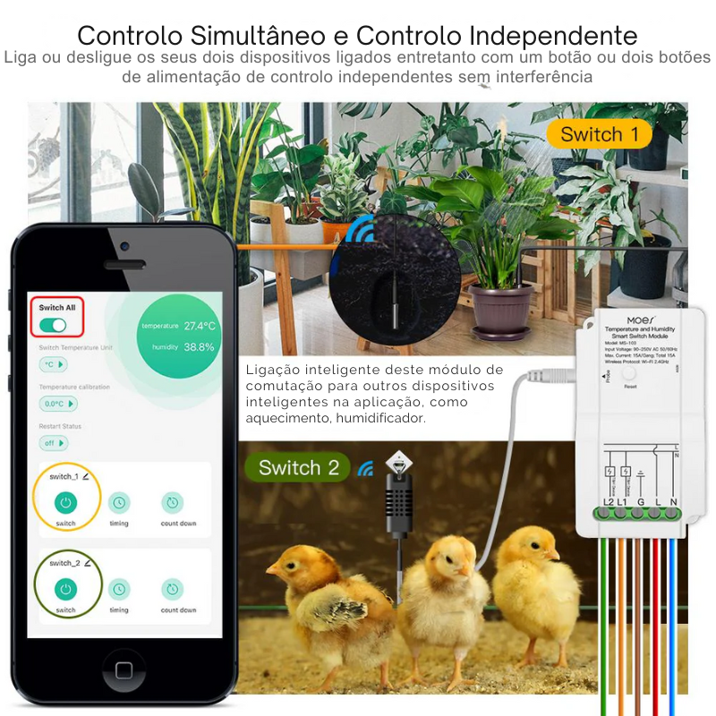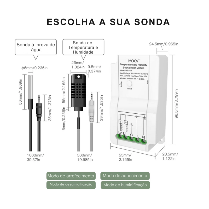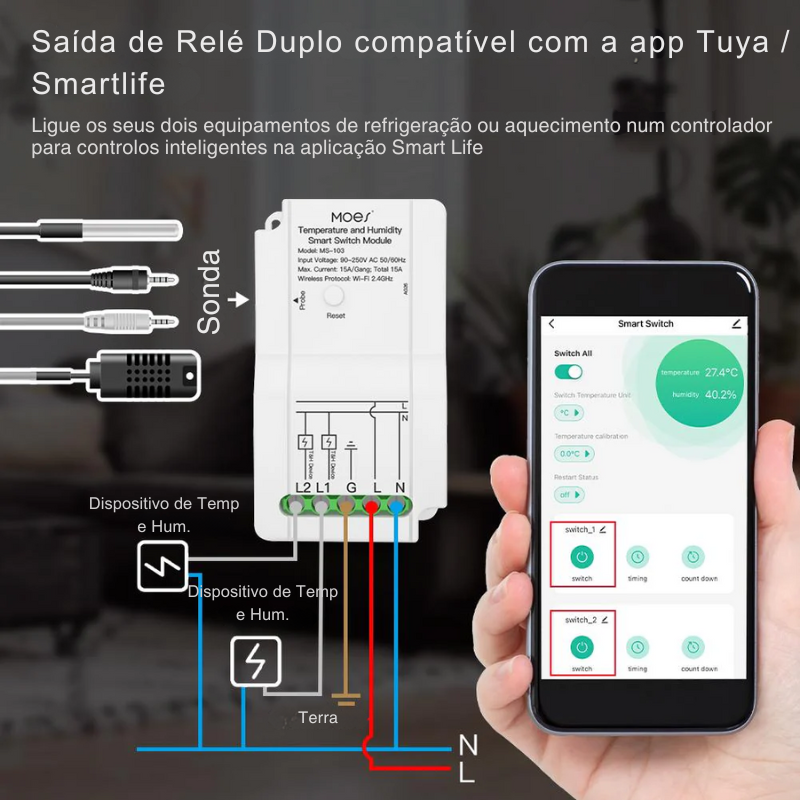 Um Sensor extremamente poderoso, que se liga na sua rede 2.4GHz e permite controlar 2 sondas de temperatura e humidade e que controlam 2 relés de forma independente, tudo conectado diretamente na app Tuya Smart ou Smartlife. Desenhado para controlo de temperatura e humidade em tempo real.