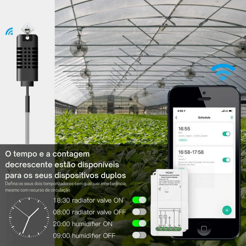 Controlo Manual e Automático: Na app poderá definir o controlo automático de gestão de On/Off, ou definir horários manuais, para aquecer, arrefecer, regar para poder manter as suas plantas, animais, dispositivos.