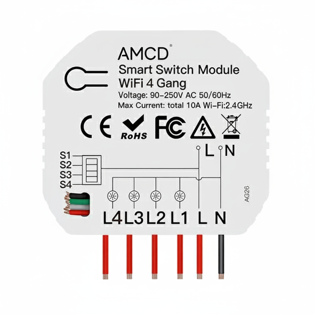 AMCD Interruptor de luz inteligente Wi-Fi módulo de interruptor de bricolage 4 Gang multi-controlo 1/2 Way, compatível com Tuya/Smart Life App, controlo remoto sem fios, Alexa e Google Home