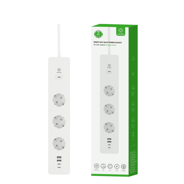 O Smart Power Strip vem com a função de medidor de energia por meio do aplicativo WOOX Home ou WOOX Security.
